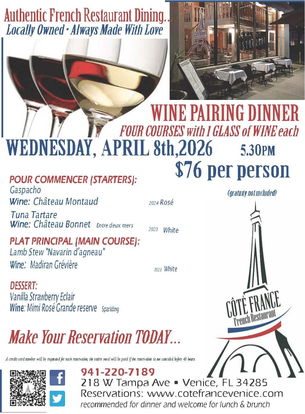Next wine pairing dinner at Côté France will be on Wednesday April 8th.